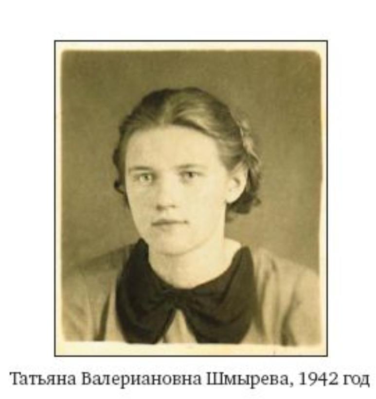 Татьяна Валериановна Шмырёва (08.01.1922 — 19.03.2002). Дочь Натальи и Валериана. Родилась в поселке Качалкино Московской области. С 1933 года жила в Москве. Училась в Тимирязевской сельскохозяйственной академии. Микробиолог, кандидат биологических наук (1953).
