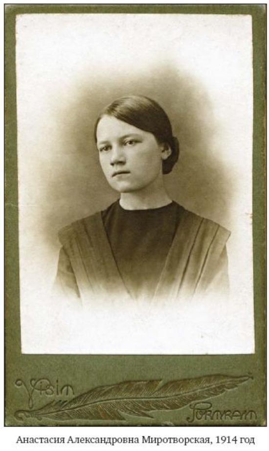 Мария Васильевна Миротворская. Дочь священника. Вышла замуж за А.М. Миротворского в 1889 году. Домохозяйка, занималась воспитанием детей. Умерла от «испанки» (форма гриппа) в Скопине в ноябре 1918 года.