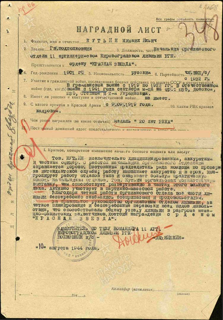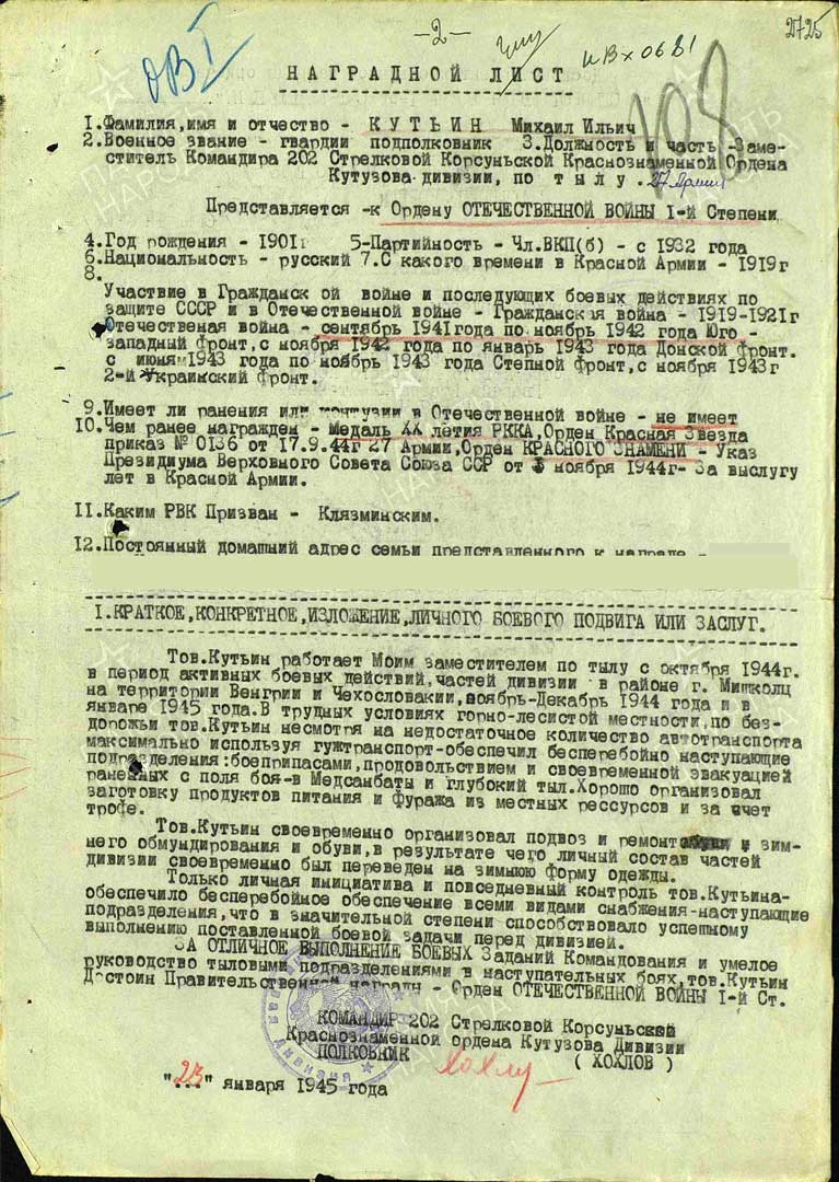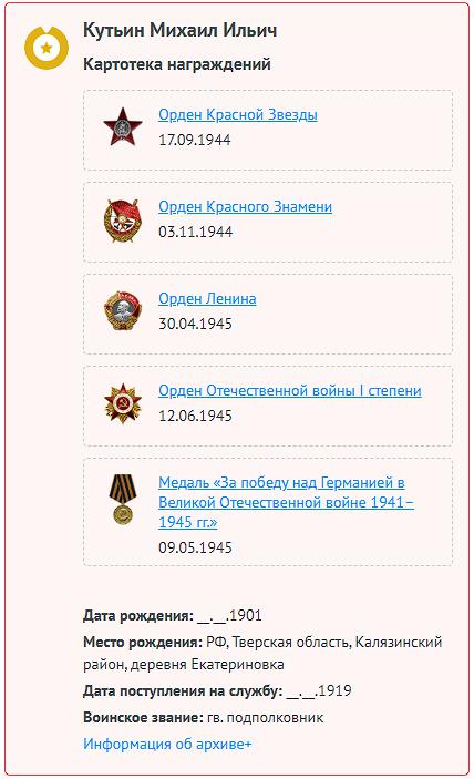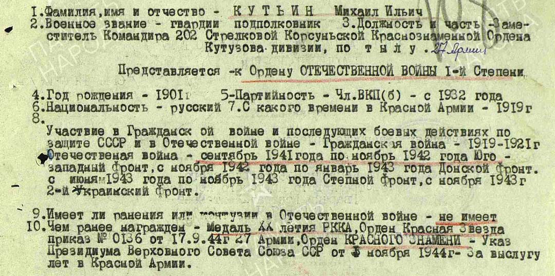 - Представление имеется https://pamyat-naroda.ru/heroes/podvig-chelovek_predstavlenie1530374147/, но награждён ли...? Вопрос. Но судя по всему и по документам о других награждениях (особенно Орденом Отечественной войны I степени в 1945 году - НЕ награждён) - примечание Авт.сайта