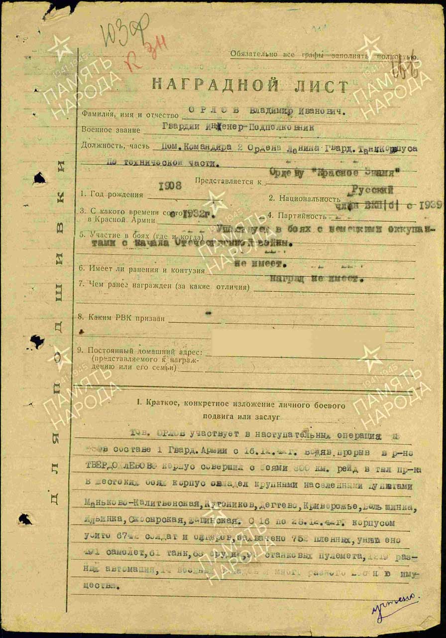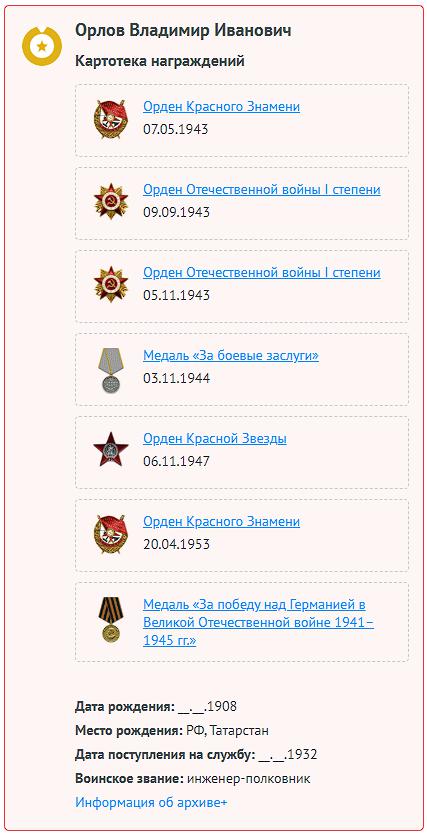 Дата и место рождения: Владимир Иванович родился 25.03.1908 года. Татарская АССР, Куйбышевский р-н, д. Болгары.