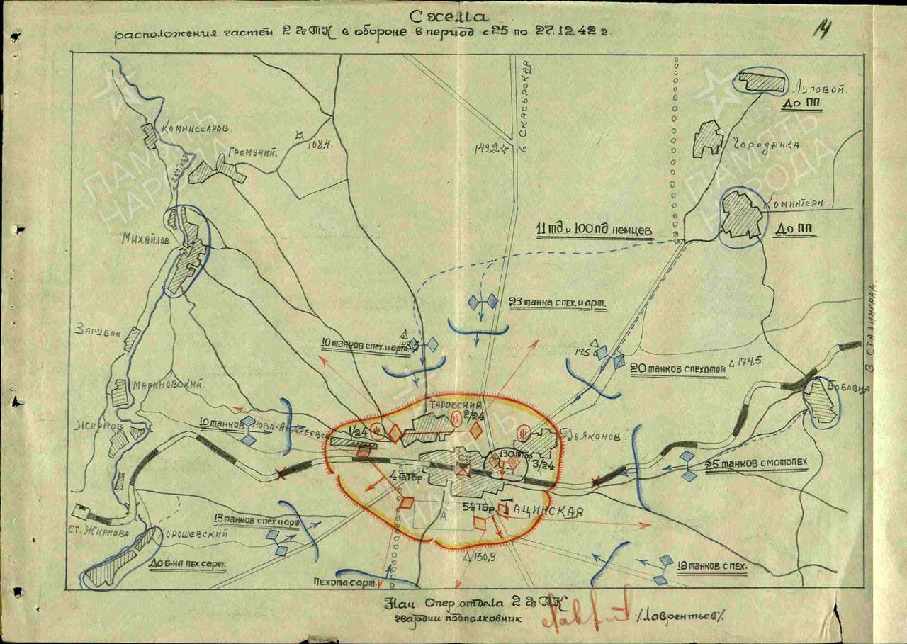 В 7:30 противник повёл активное наступление в направлении выс. 143.5 10 танков с пехотой и артиллерией, по дороге из Скосырская на Тацинская 23 танка с пехотой и артиллерией, с района высоты 175 20 танков……, с разъезда Беженец 25 танков с мотопехотой в направлении фермы 4. 15 танков с мотопехотой, с направления выс. 146.9 до батальона пехоты с артиллерией, с кургана до двух рот пехоты с артиллерией, с направления Хорошевский 13 танков с пехотой и артиллерией, с направления Морозовский 10 с пехотой и артиллерией.